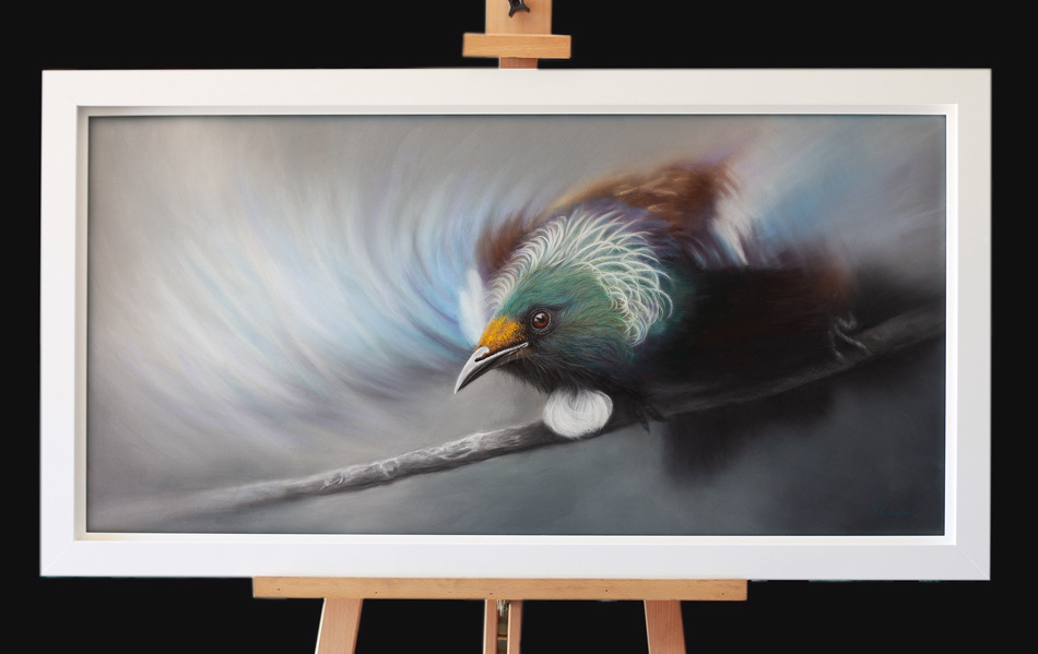 Tuis are undeniably the boss in the New Zealand native bird world, hence the title. You will understand if you've witnessed a tui flying in and bossing out the other birds from 'their' tree! I usually like to paint from my own reference photography, but when I saw a photo by fellow artist Melissa Boardman, it just spoke to me... thank you Melissa for allowing me to use your beautiful photo as a reference! I had been visualising a series of paintings evolving to show the movement of birds in flight, pastel being a perfect medium to show this with its blendability and softness. Melissa is an illustrative artist, who also frequents Zealandia Eco Sanctuary for reference photos and for the pure enjoyment of hanging out with the birds. Melissa was a fellow artist in the group bird exhibition at Bowen House, Parliamentary Buildings.