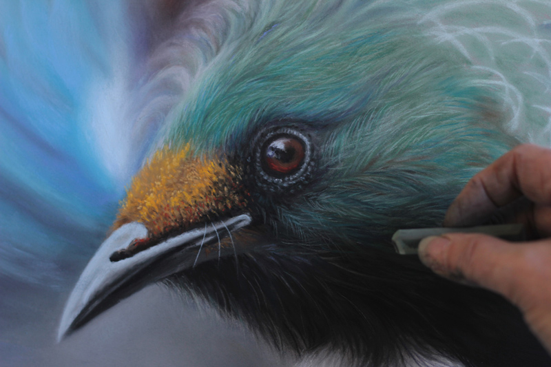 Closeups of the artwork, working with primarily soft pastels, with pastel pencil for detailing around the central bird in focus