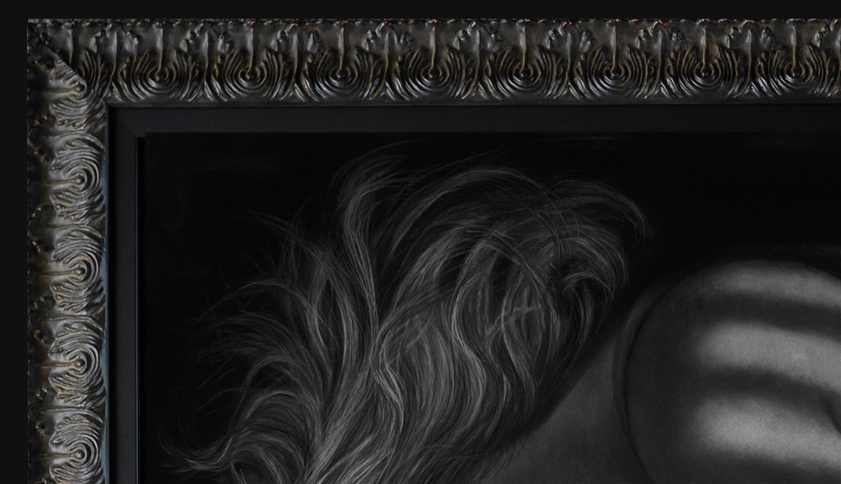 The moulding has a slight antique copper patina, and is framed with a simplistic black inner frame, which sets it off beautifully.