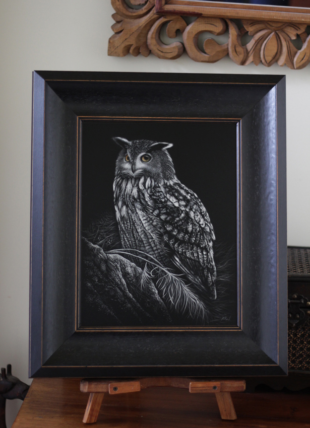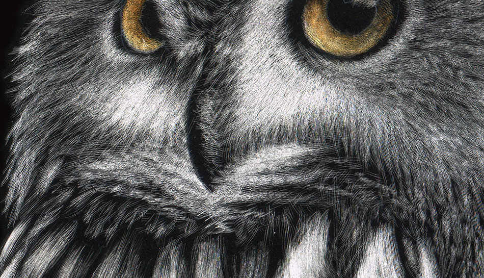 Closeup detailing of the scratchboard artwork, mostly etched with tattoo needles