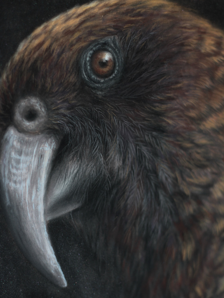 Closeup of the artwork. Anthracite pearlescent pan pastels are used in the background, with pearlescent pastels also used in the copper and gold on the keas feathers to give that iridescent sheen that keas have.