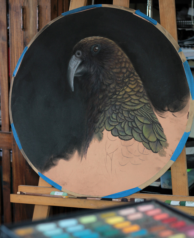 This will be framed in a lovely minimal round 80cm black frame with black metallic matboard (photo to come). Here is the kea whilst he was still on my easel, lots of colours used, such beautiful birds.