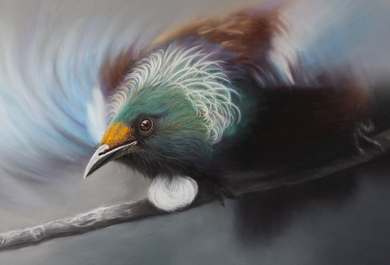 Tuis are undeniably the boss in the New Zealand native bird world, hence the title. You will understand if you've witnessed a tui flying in and bossing out the other birds from 'their' tree! I usually like to paint from my own reference photography, but when I saw a photo by fellow artist Melissa Boardman, it just spoke to me... thank you Melissa for allowing me to use your beautiful photo as a reference! I had been visualising a series of paintings evolving to show the movement of birds in flight, pastel being a perfect medium to show this with its blendability and softness. Melissa is an illustrative artist, who also frequents Zealandia Eco Sanctuary for reference photos and for the pure enjoyment of hanging out with the birds. Melissa was a fellow artist in the group bird exhibition at Bowen House, Parliamentary Buildings.