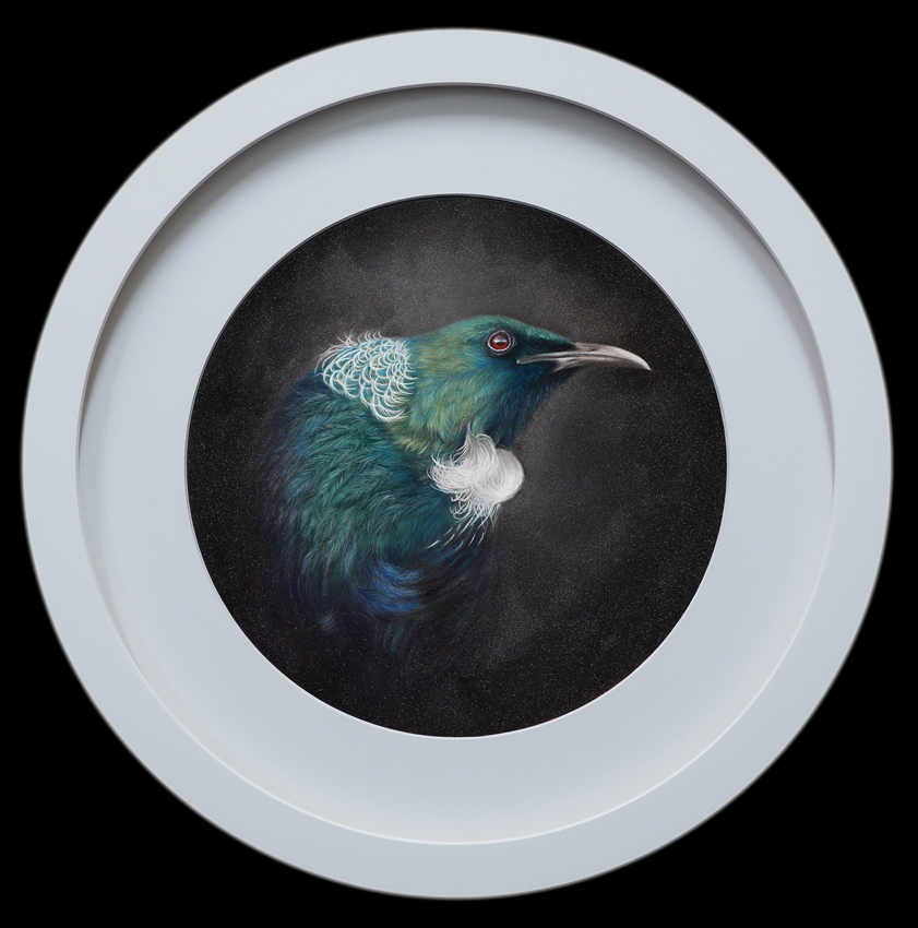 Closeup of the artwork. Anthracite pearlescent pan pastels are used in the background, with pearlescent pastels also used in the feathers of the tui to give that iridescent sheen that tuis have.