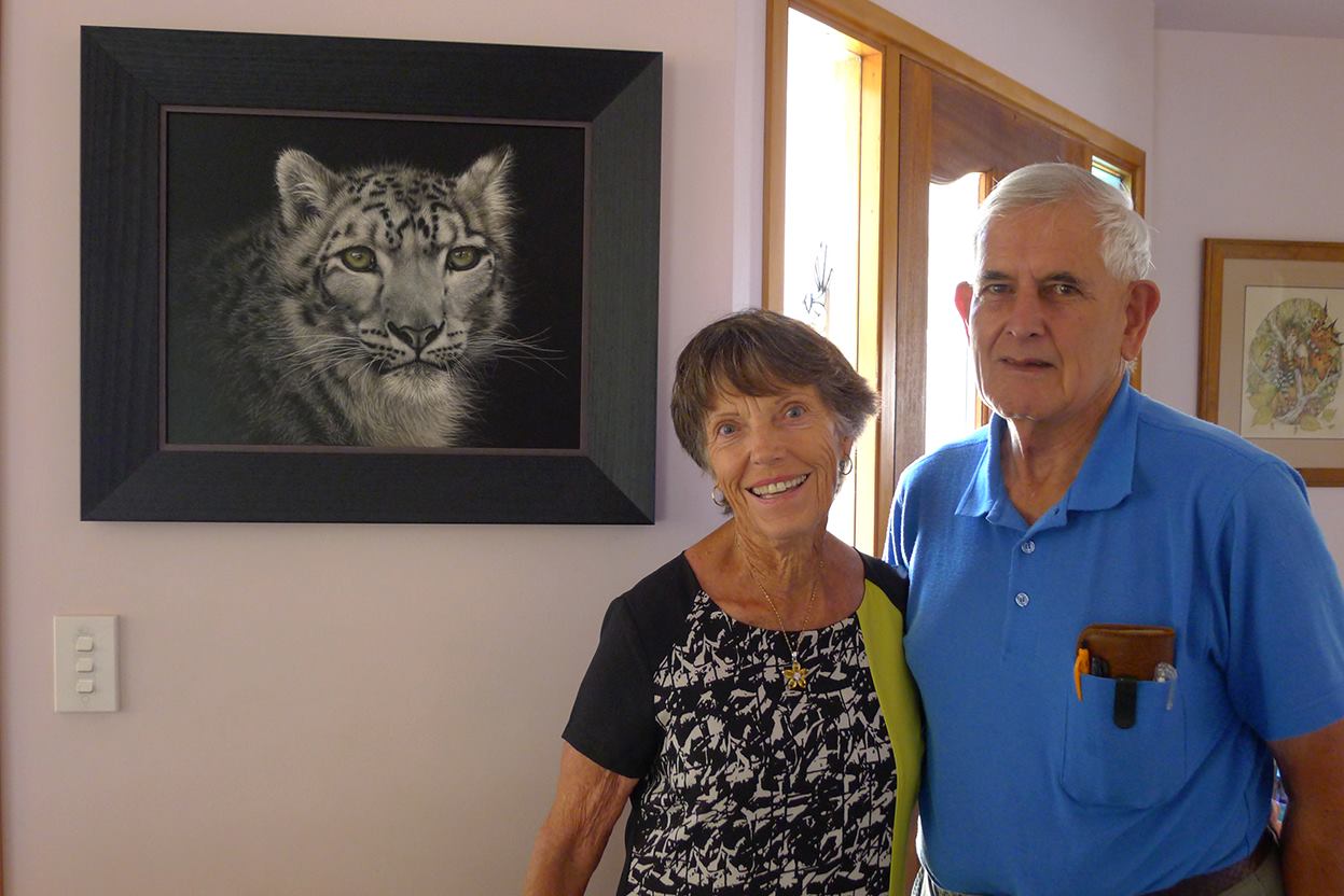 "We have the presence of a "real, live" Himalayan Snow Leopard in our home. Karen has lifted this "sculptured", in-depth living image from a scratchboard. It is brilliant! Mimi has us in her gaze wherever we are in our living area - those eyes remain fixed on us as we move about! We are under constant silent scrutiny.