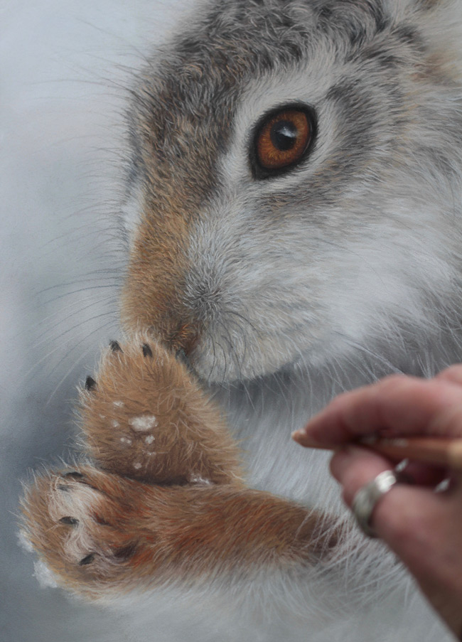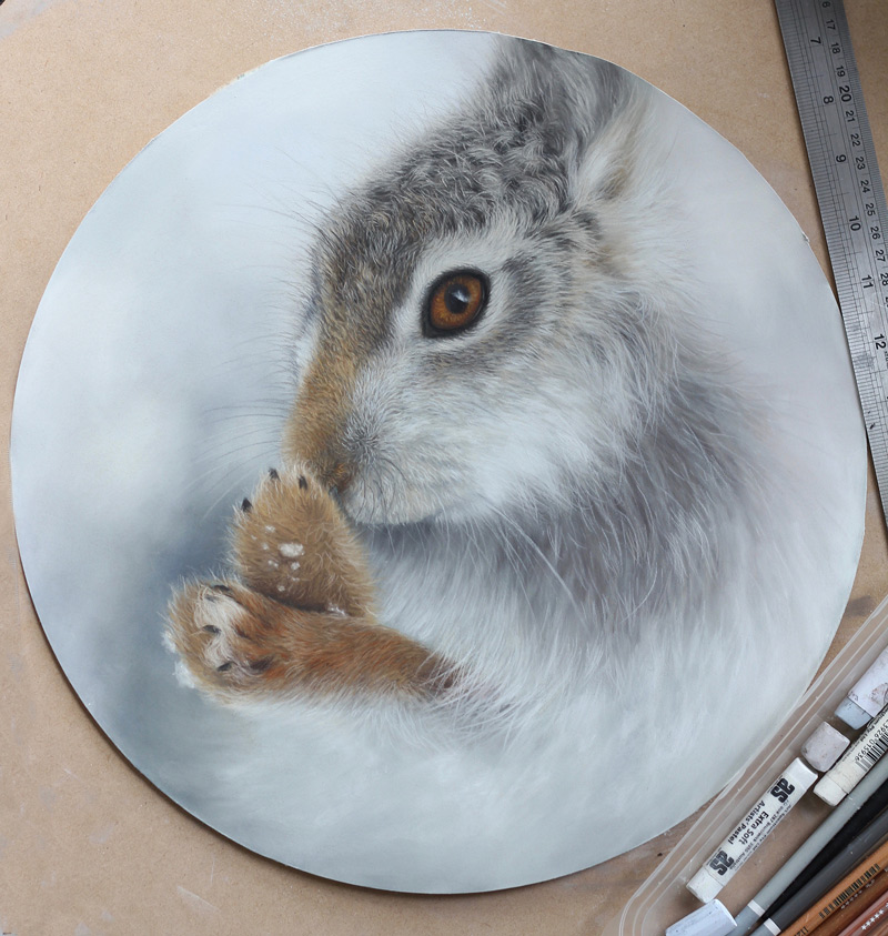 I loved the subtle softness of the hare & snowy surroundings in the beautiful reference photo and pastels seemed the perfect medium to try and do justice to this subtelty. Thanks so much to Karen Deakin Photography, a talented lovely friend from Edinburgh for the awesome reference photo. Karen and husband John were fortunate to spend a few days trekking in the mountainous highlands to observe and photograph these little guys. Such special animals..they turn white in the snowy winters as camouflage against predators, this guy still has some grey on him at this stage. I hope to one day venture up into the Scottish mountains to see them.