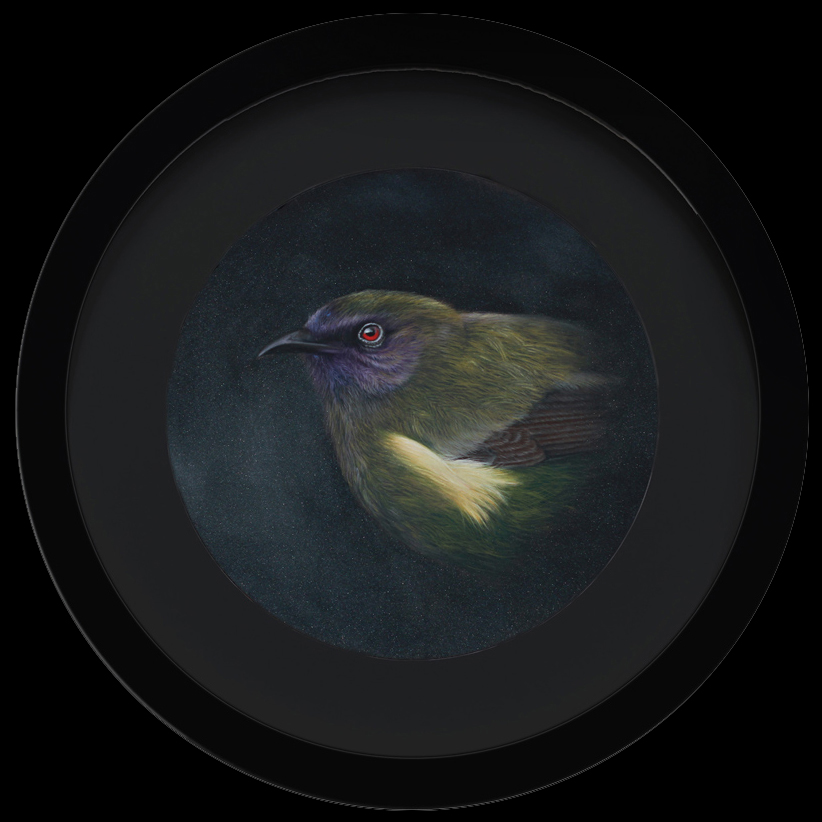 A New Zealand dawn chorus af Bellbird and Tui is an incredible thing to experience! The bellbirds have the most melodious song, very similar to Tuis but I think even more beautiful than their better known pals. Using anthracite & pewter sparkly background and pan pastels, soft pastels and pencils for bird detailing.